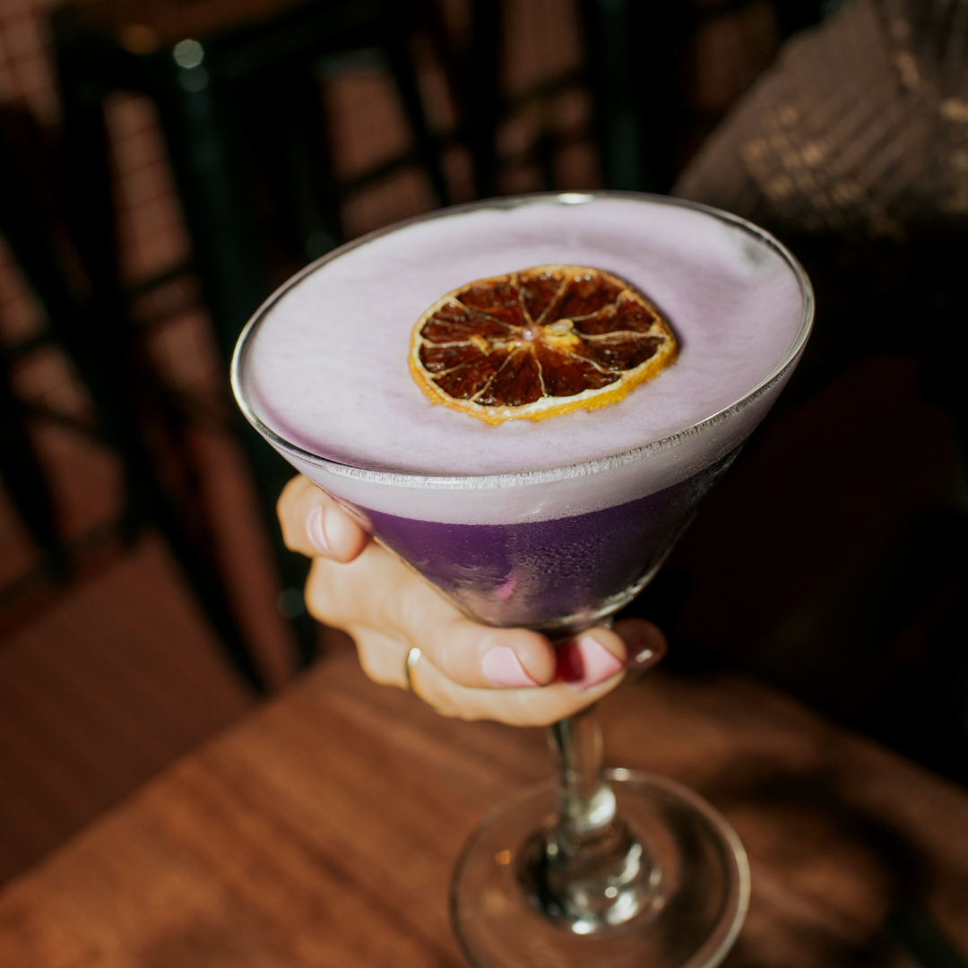 St-Germain Elderflower Liqueur, Captain Morgan White Rum, Aquafaba, Ube Syrup