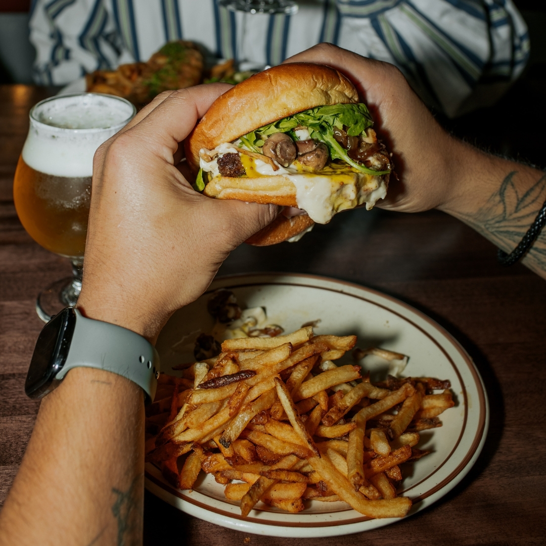 Smoked beef patty, béchamel sauce, mushrooms, caramelized onions, arugula, beer & maple mustard. Served with fries or house salad